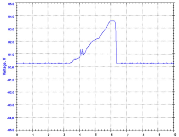 Si on accélère progressivement pour relâcher d'un coup, l'oscillo montre ceci (en abscisse la position de la pédale, en ordonnée la tension délivrée par une piste) :