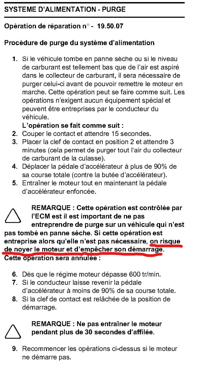 En ce qui concerne la purge, la méthode suivante diffère de ce que j'ai lu ( de plusieurs coups d'accélérateurs): Il est écrit qu'il y a un risque de noyade ce qui je pense montre qu'avec cette méthode on fait "pisser" l'injecteur à grand débit alors que le moteur ne tourne pas vite, comme à l'ancienne avec les vielles pompes mécaniques et qui normalement est impossible avec l'électronique.