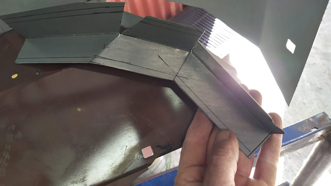 Finalement, juste avant de faire une bêtise, je pense à présenter le tunnel de boîte. En effet, c'est lui qui va me donner une côte importante pour positionner ma rustine. J'ai une découpe en V à combler, je glisse une chute derrière Et je trace Pointage de la rustine Pointage de la rustine sur le tablier Soudage et meulage, je ne suis pas très content de moi mais j'ai compris des trucs. Nouvel outil en cogitation...