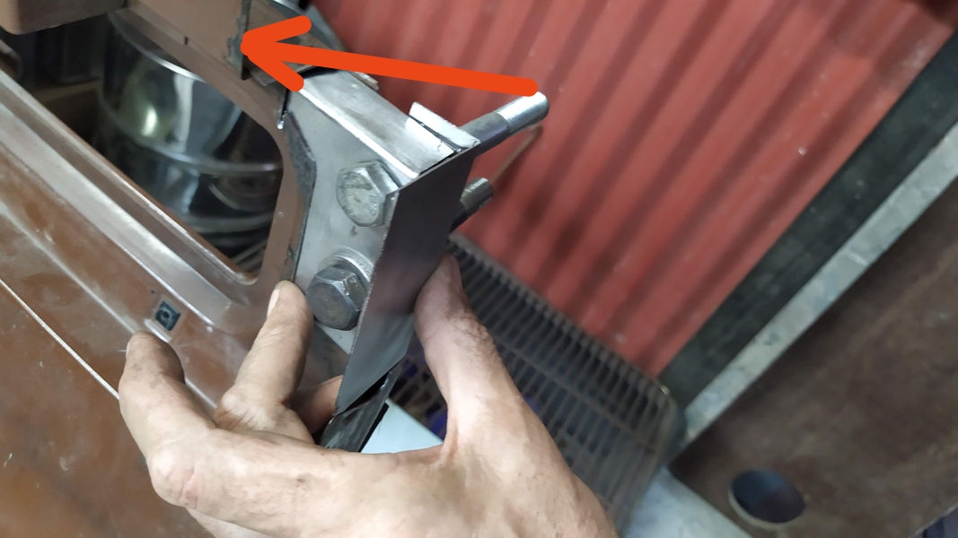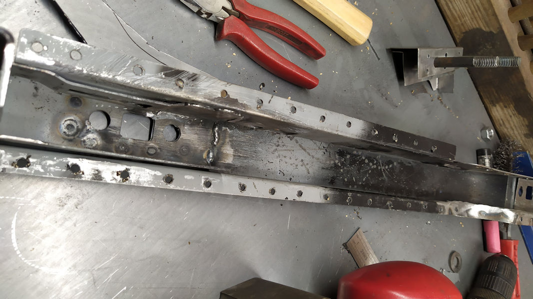 Finalement, juste avant de faire une bêtise, je pense à présenter le tunnel de boîte. En effet, c'est lui qui va me donner une côte importante pour positionner ma rustine. J'ai une découpe en V à combler, je glisse une chute derrière Et je trace Pointage de la rustine Pointage de la rustine sur le tablier Soudage et meulage, je ne suis pas très content de moi mais j'ai compris des trucs. Nouvel outil en cogitation...