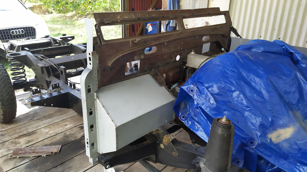 Le land est sur ses ponts avec ses roues, moteur et boîtes sont en place. Les pièces manquantes étant réparties symétriquement sur le véhicule, je me dis que leur absence ne fausse pas l'équilibre que je m'apprête à vérifier.