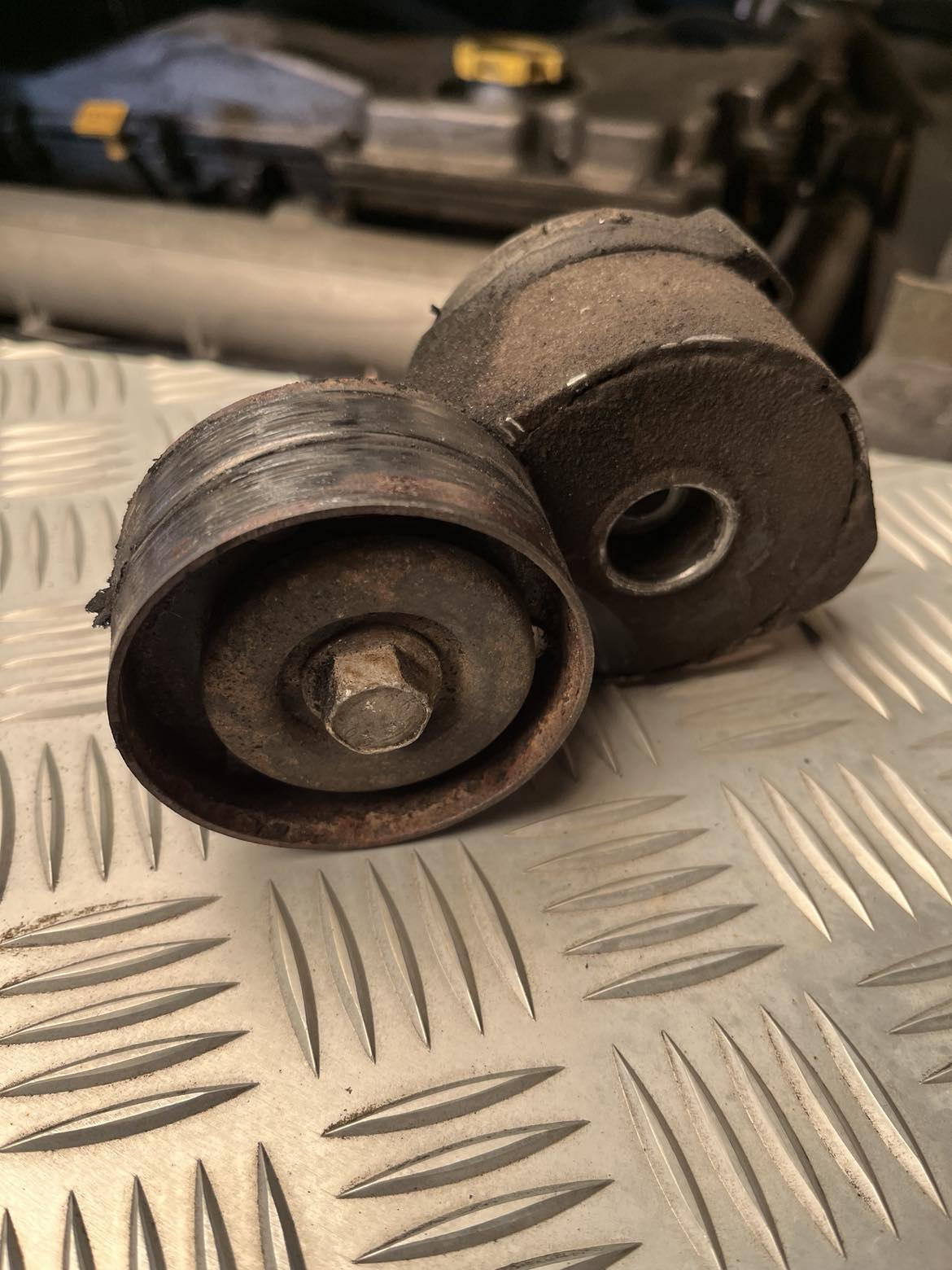Bonjour, courroie d'accessoire qui vient de péter, j'ai juste démonté le cache plastique du dessus pour faire tourner les poulies, résultat le galet tendeur est complètement bloqué