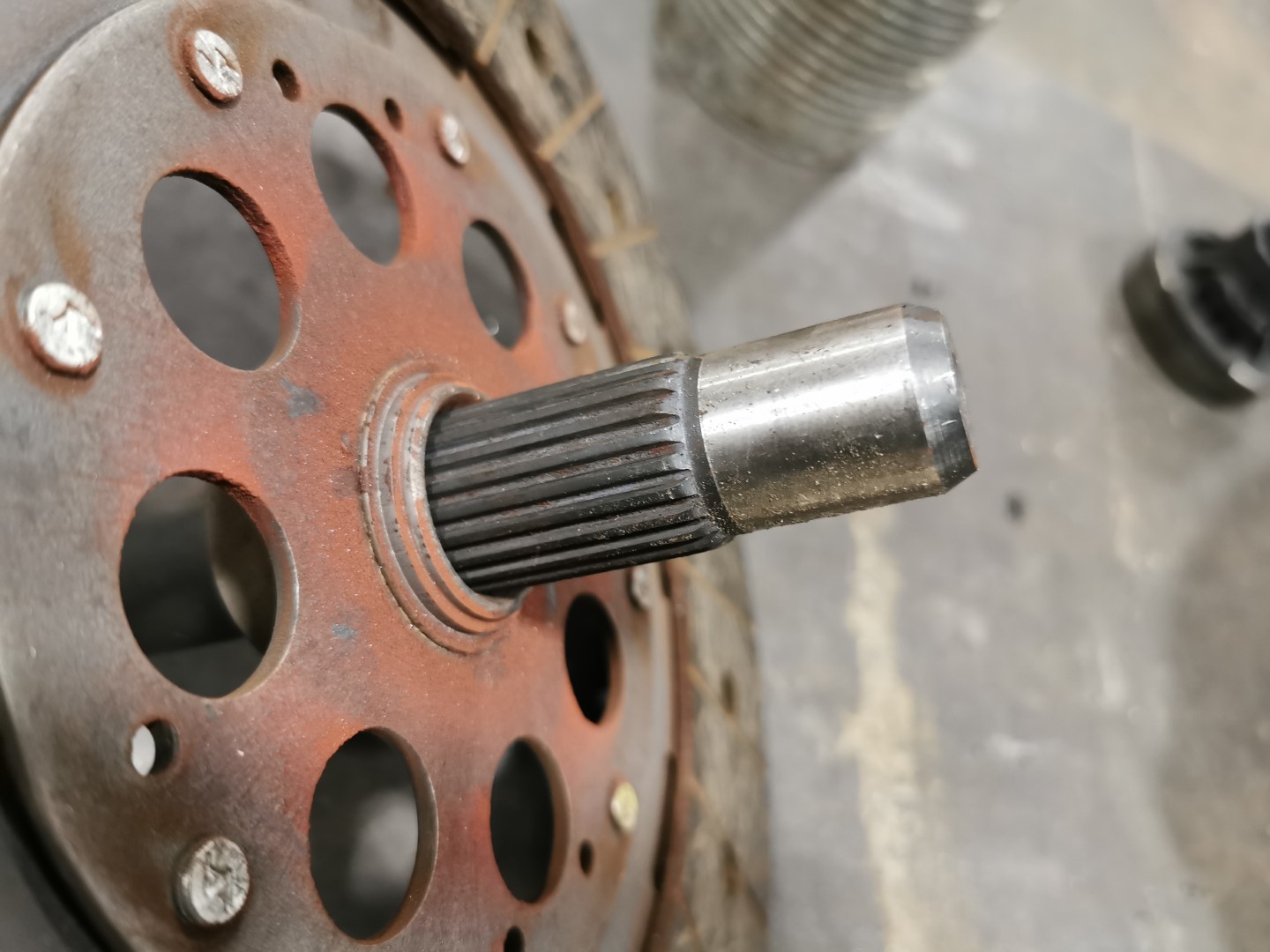 En montant le disque à l'envers, on limite la pénétration de l'arbre d'entrée de boite de vitesse. Voici ce qui dépasserait du disque côté moteur, avec le disque monté à l'envers: ce qui donne, une fois le disque posé contre le volant-moteur, un dépassement comme ceci, en direction du vilebrequin: Si on compare au schéma en coupe donné ci-dessus, on voit qu'on est pas loin de la limite. Je n'ai malheureusement pas les mesures VM/bloc ou arbre de boite/cloche d'embrayage, donc difficile de dire s'il y aurait du jeu ou pas.
