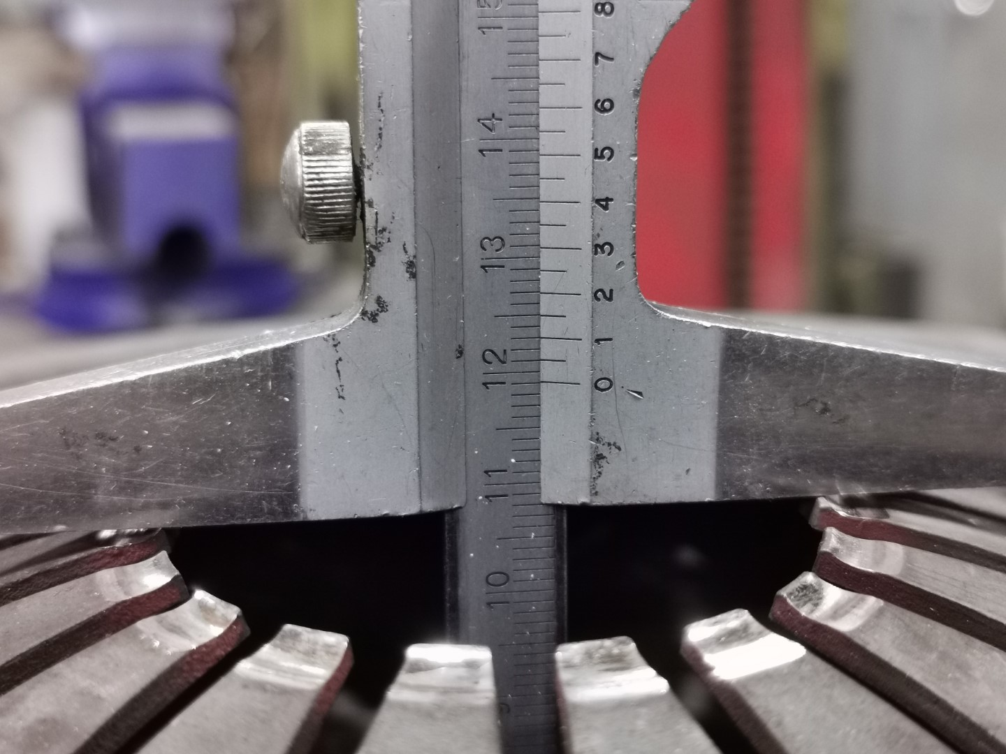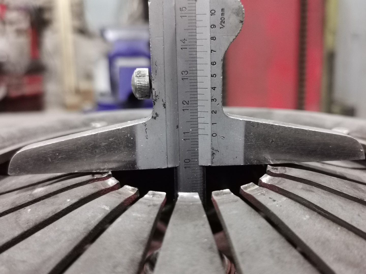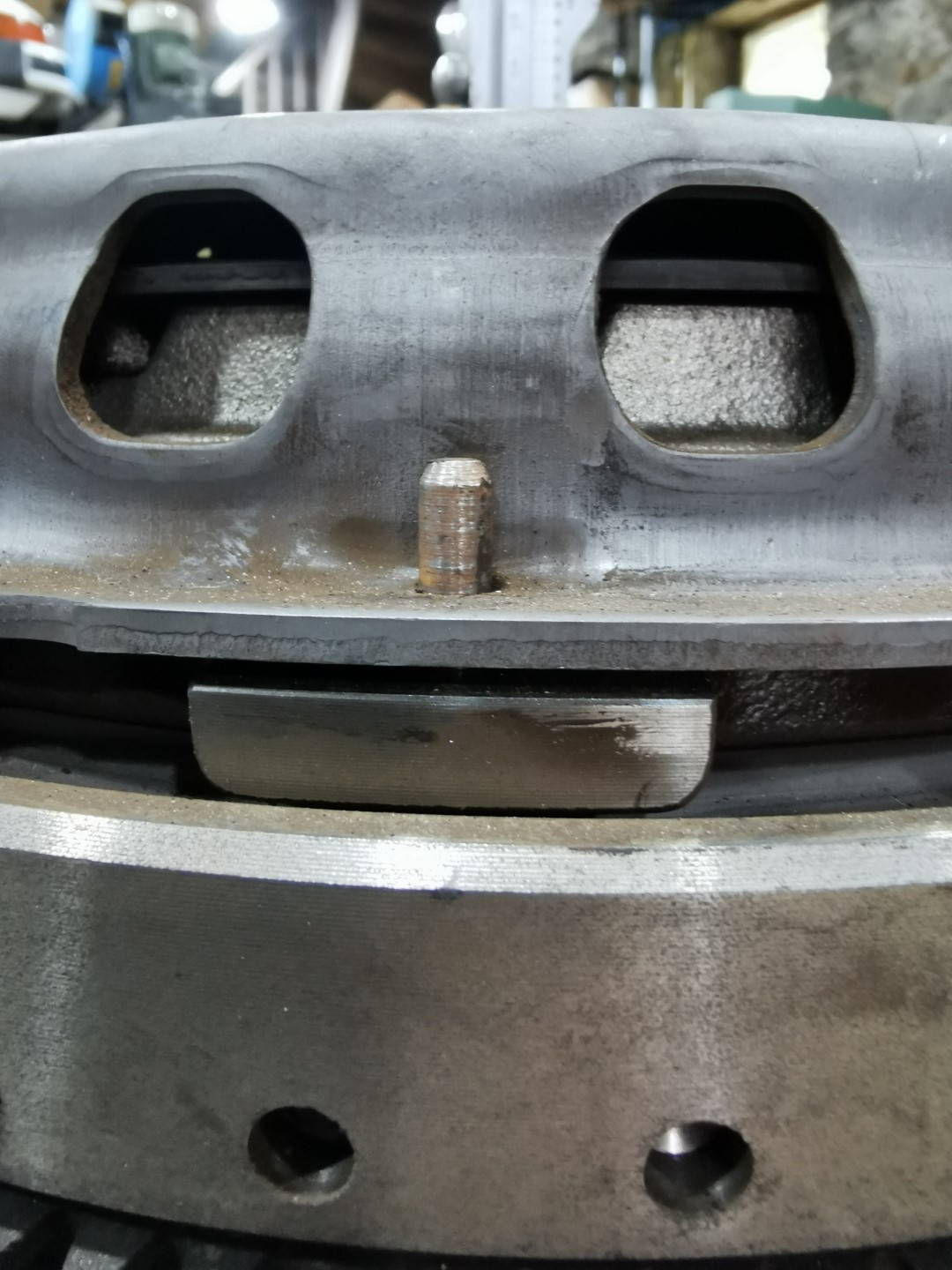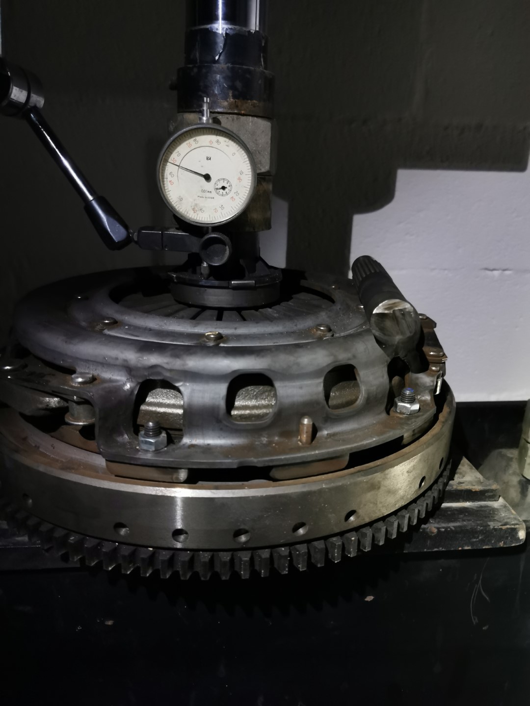 Rebelotte après avoir déserré les 6 écrous de maintien du mécanisme: Ici, la course totale de la butée, avant d'arriver à faire tourner le disque à la main, est d'environ 10mm. Cette distance correspond aux 7.5mm ci-dessus, auxquels on rajoute les 2.5 nécessaires pour que la cloche de mécanisme vienne entrer en contact avec le VM.