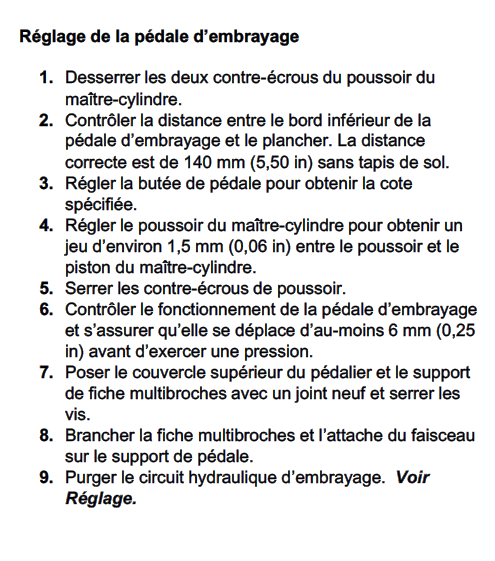 2/- Mais, je voudrais aussi procéder au réglage de la commande d'émetteur ainsi qu'au réglage de la butée de pédale. Et je ne sais pas comment faire ni si j'en suis capable. Pour ces 2 réglages, qui peut m'indiquer la procédure ?