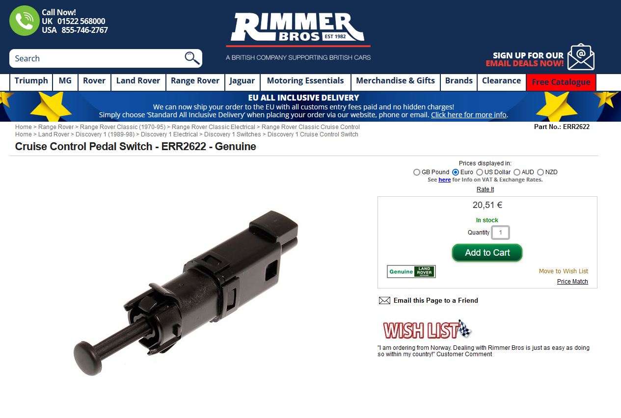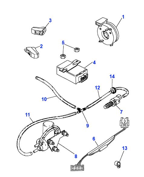 Le régulateur de vitesse est un système Hella et a été installé sur de nombreuses voitures, si vous cherchez des pièces dans un parc à ferraille regardez également les années 80 et 90 de l’Audi Volvo VW’s Jag’s Citroen’s Merc’s & search BMW! Les références des modules sont Landrover AVR 1173 Hella 5GA-004-397-**, la pompe Vacuum : Land Rover PRC6260, le contacteur de frein : Land Rover ERR2622 ;