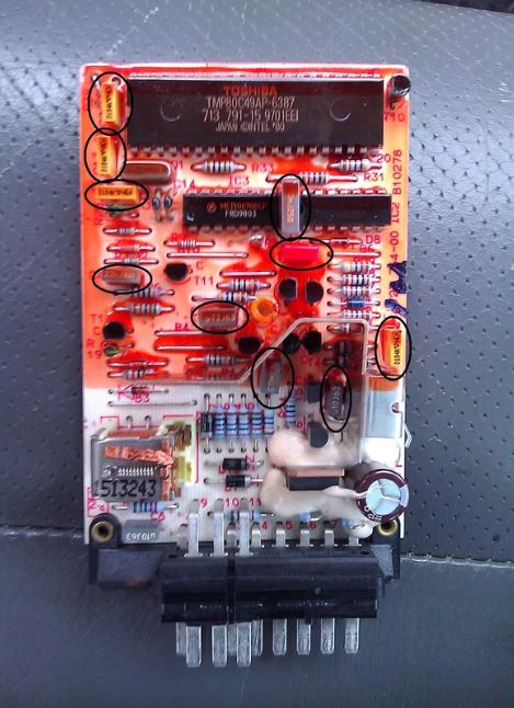 Une fois le module retiré, à l’aide d’un tournevis plat, retirer les languettes métalliques du boîtier en plastique. Retirez doucement le boîtier d’extrémité en plastique, puis faites glisser doucement le PCB. Si votre assez pratique avec un fer à souder, vous aurez besoin de réparer les joints secs. Les suspects habituels sont les condensateurs indiqués ici :