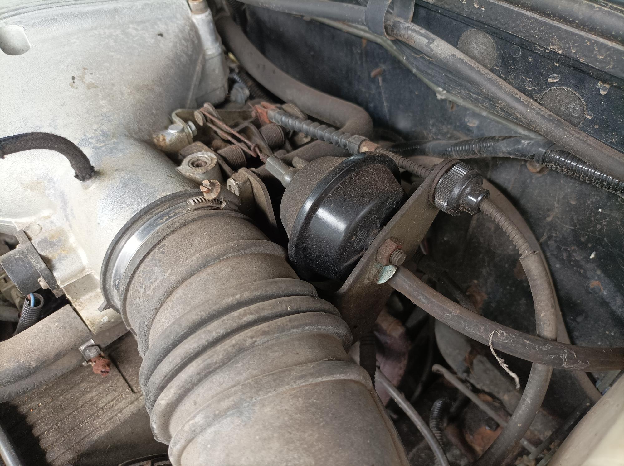 Le côté mécanique du régulateur de vitesse utilise des soufflets à dépression pour ouvrir les gaz et ajuster votre vitesse. Il ne fonctionne pas à vide moteur, il a une pompe séparée, située derrière le phare latéral proche sous le cric. De là, un tuyau descend le long de l’aile intérieure du côté proche jusqu’à un T' derrière le bocal de lave-glace. 1 port sur le T' va au soufflet sur le corps de la manette des gaz, l’autre jambe du T' court ensuite le long du pare-feu et dans la cabine juste au-dessus de la pédale de commande de frein.