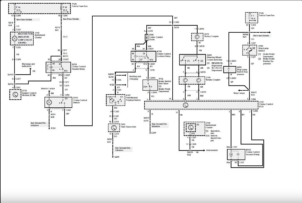 Si votre voyant de vérification du moteur est allumé, le régulateur de vitesse est désactivé, alors vérifiez avant de continuer! Le diagramme de circuit du régulateur de vitesse se trouve dans le manuel de l’atelier, mais il est divisé en plusieurs pages. Voici donc un diagramme complet du circuit du régulateur de vitesse :