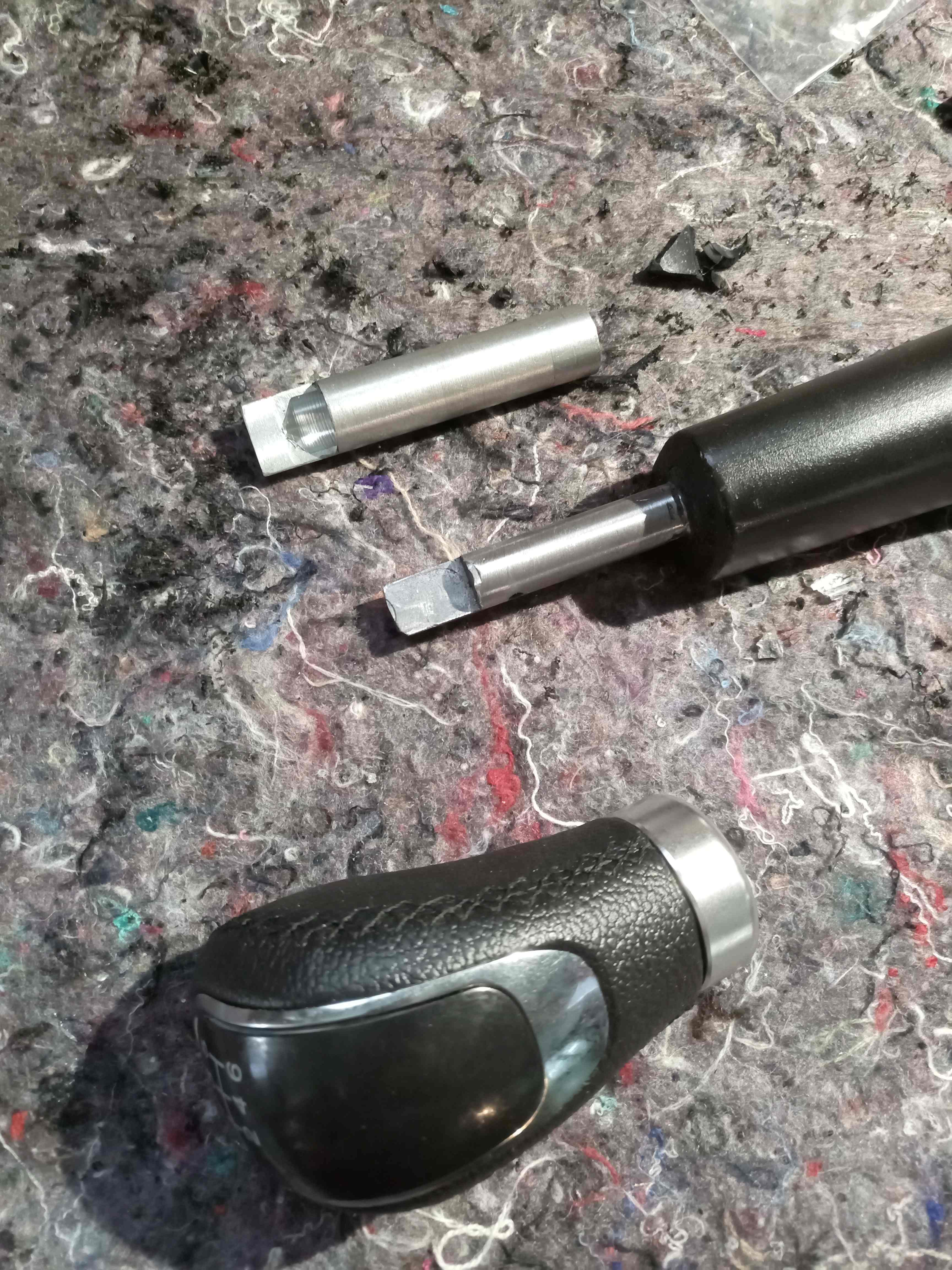 Les 3 composants , pommeau , adaptateur en alu et le levier de vitesse (tige en acier).