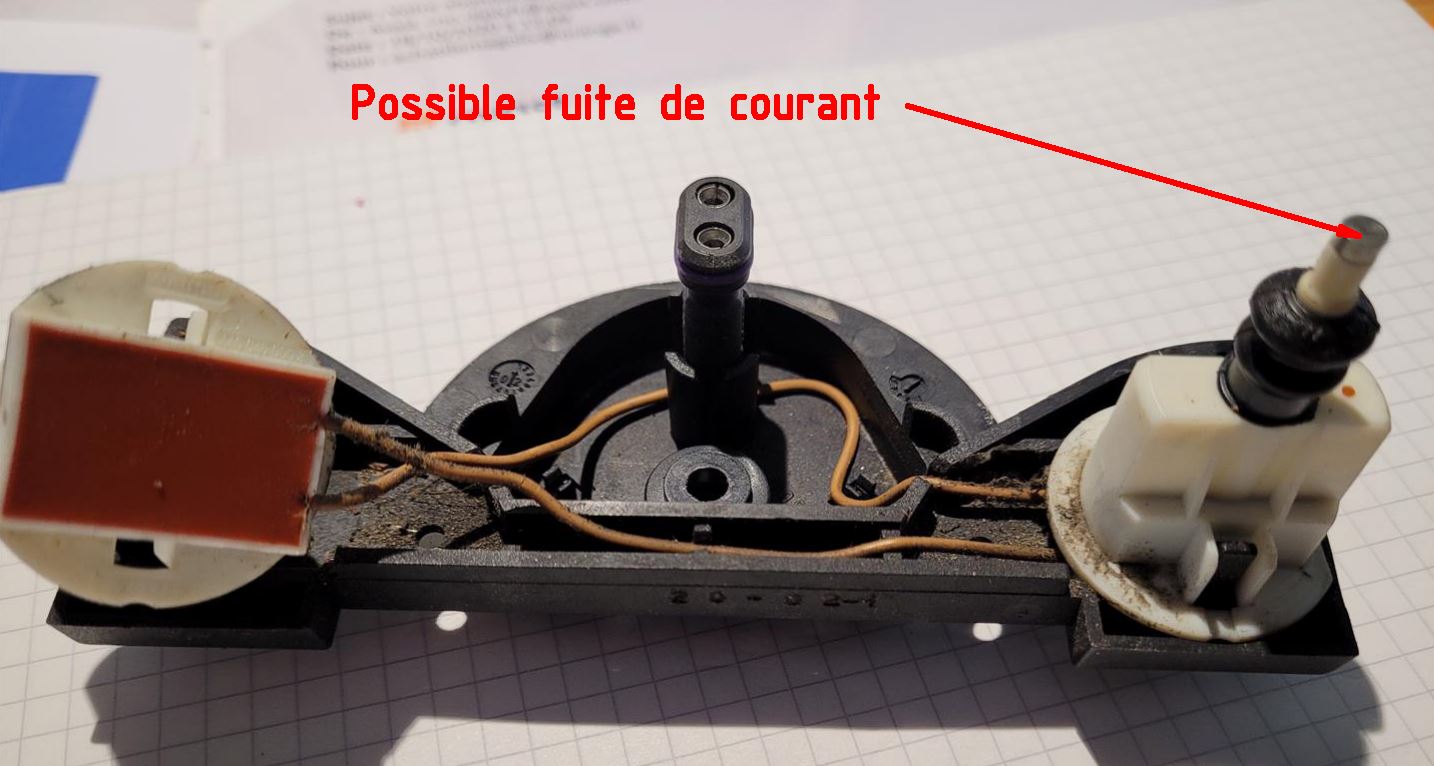 Une des hypothèses que j'ai en tête, c'est qu'il y a un schmilblick dans la résine du premier contacteur situé sur le passage du courant. On aurait alors un courant de fuite qui remonterait, via une des résistances, puis la coiffe métallique de ce contacteur, dans le bloc ABS. C'est en effet la seule possibilité, le reste du bloc navettes étant entièrement en plastique.