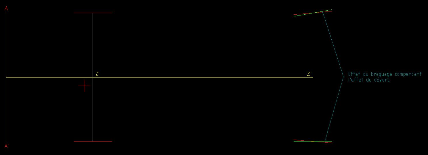 L’axe vert AA’ est strictement perpendiculaire à ZZ’ — donc parfaitement parallèle aux ponts — et supposé placé à un mètre (valeur totalement arbitraire) du pont arrière.