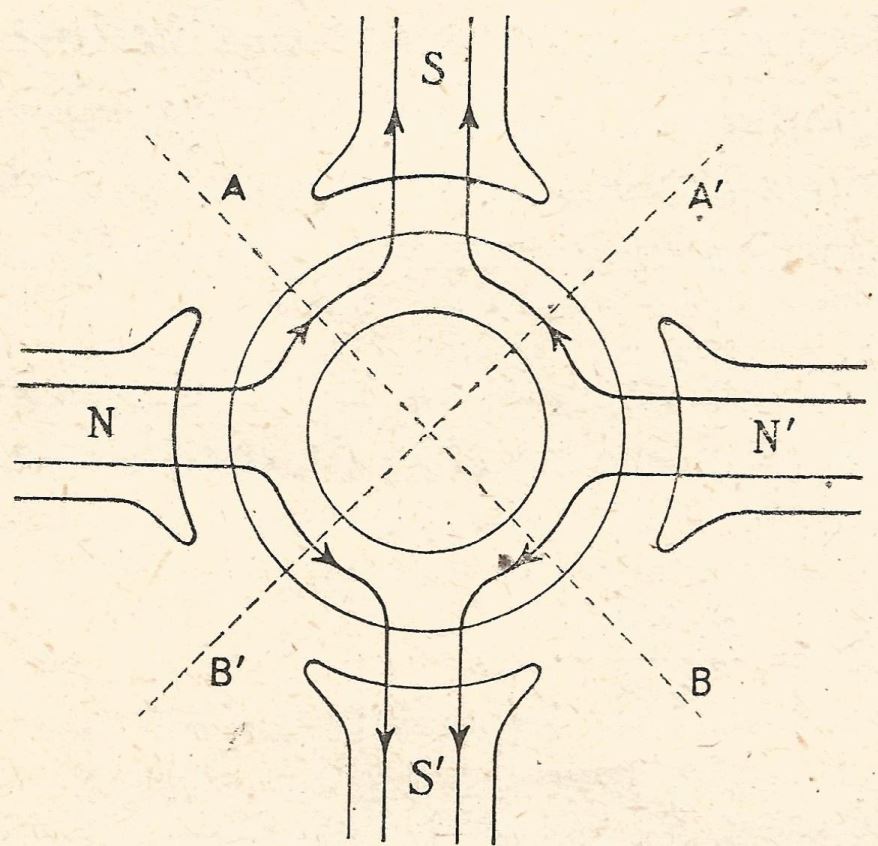 Sur ce moteur à quatre pôles équivalant à ton démarreur figurent les plans neutres (droites AB et A'B') délimitant les champs magnétiques générés par les quatre bobines fixes (l'ensemble inducteur).