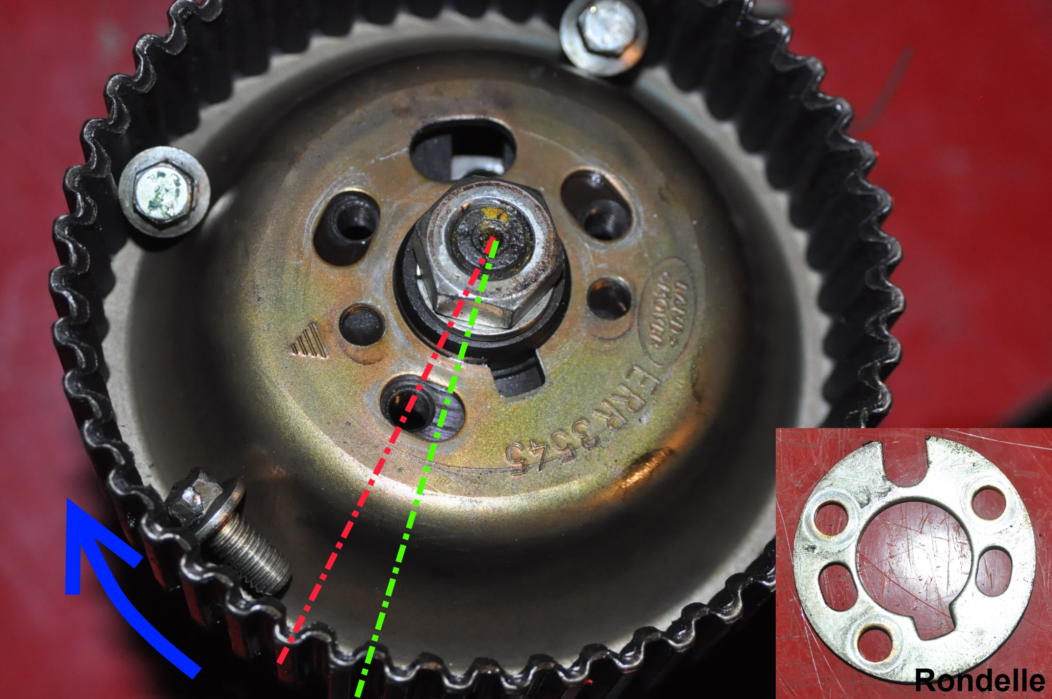 Une fois la pompe pigée et la bride correctement serrée au couple, on peut tranquillou la remonter sur le moteur selon la procédure habituelle et terminer le réglage de la courroie par ajustement angulaire du pignon d'entraînement sur ses boutonnières.