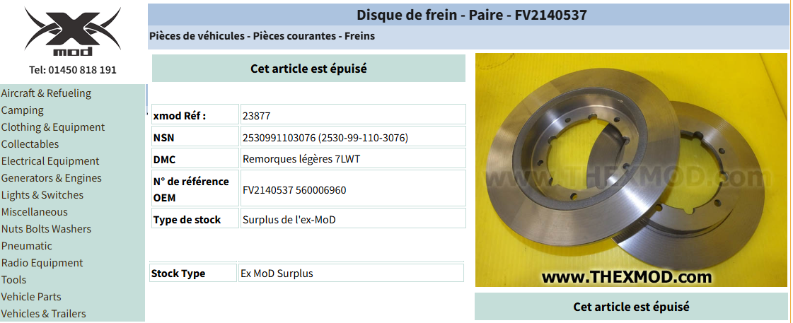 Comme je suis du genre tenace, j’ai fini par trouver ce site, qui commercialise des disques de frein et autres matériels militaires ; en voyant ce site, j'ai cru que je touchai au but .... hélas, la référence des disques est épuisée, et je ne sais pas vers qui me tourner ....