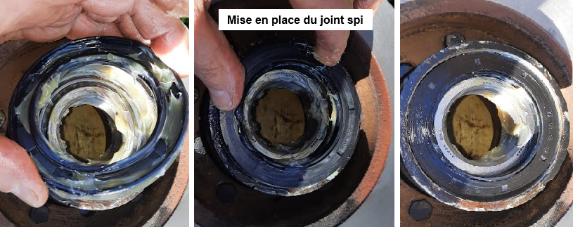 j'ai bien posé les 2 cônes dans le bon sens, en les graissant avant de tapoter à l'aide d'un maillet et de l'ancien cône pour m'assurer qu'ils sont bien en place, mais comme le moyeu était venu avec le joint spi, sans la cuvette du roulement, resté sur la fusée, j'ai remonté le joint spi AVANT de mettre la cuvette neuve ....