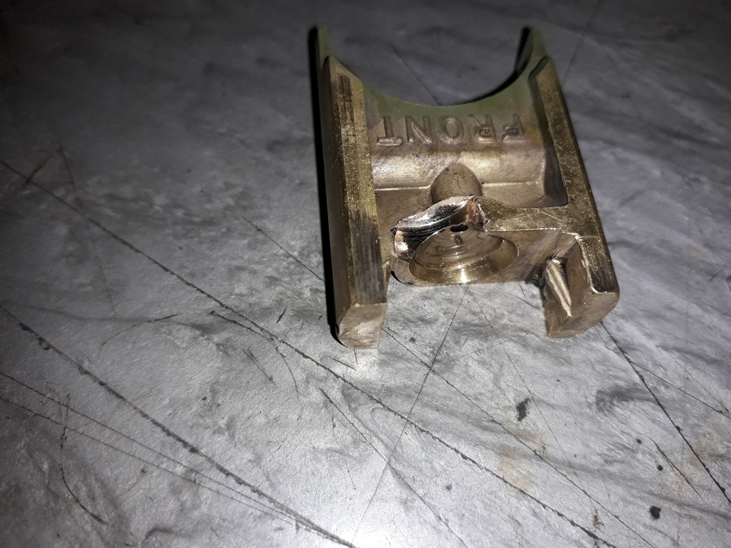 Ce que je n'aime pas, c'est la trace d'usure latérale sur la photo 160610 : elle montre que l'effort était excentré dans deux des dimensions encadrant le mouvement de la glissière, ce qui signifie qu'il y a probablement d'autres dégâts ailleurs, les zones de contact s'étant étendues à des secteurs non prévus pour les encaisser. Vérifie également la vis pointeau verrouillant le poussoir en position ainsi que la rainure usinée dans la glissière dans laquelle elle s'engage ; sur la photo, tout à l'air normal, mais vu l'angle de la prise de vue, pas facile d'être catégorique.