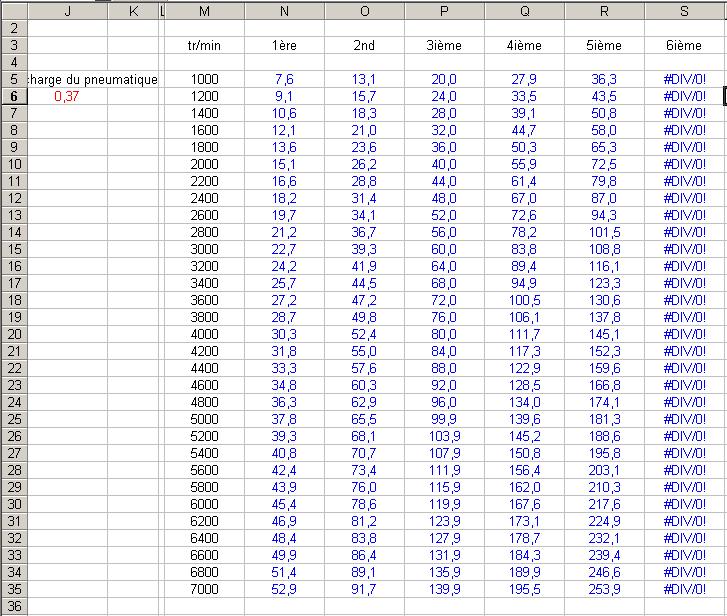 Le fichier va aussi calculer, sur la même page, toutes les vitesses pour la plage de régime moteur, de 200 tr/min en 200 tr/min, jusqu’à 7000 tr/min, pour chaque rapport, BT en longues.
