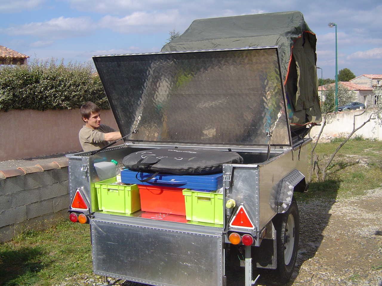 La ceinture de caisse est terminée, ainsi que la ridelle.J'ai abandonné l'idée de faire 2 capots articulés (1 avant et 1 arrière).Pour cause, le poids de la tente sur le capot avant.Donc celui-ci sera fixe et j'aménagerai ultérieurement deux grandes trappes sur la face avant.Comme je ne veux pas que la tente dépasse au dessus du timon, évidement elle dépasse sur le capot arrière.Donc il a fallu que j'aménage un sytème pour la décaller sur le timon pour avoir accès à l'arrière.