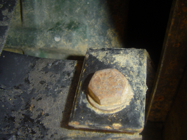 Je n'ai qu'une seule photo pour l'attache avant, et elle n'est pas beaucoup parlante.Pour l'avant donc, on retrouve une même platine boulonée, soudée sur une bonne cornière (40x40x3), fixée sur les vis d'attaches de l'aile sur le tablier.A la base de cette cornière, il y a une platine qui prend appui sur le chassis, et qui est pliée à l'équère pour se fixer sur le gros boulon d'attache de la caisse (c'est ce qu'on voit sur la photo).