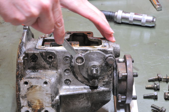 Dévisser les deux vis maintenant le logement du roulement de pignon primaire. J'ai du utiliser un tournevis à choc pour les débloquer.