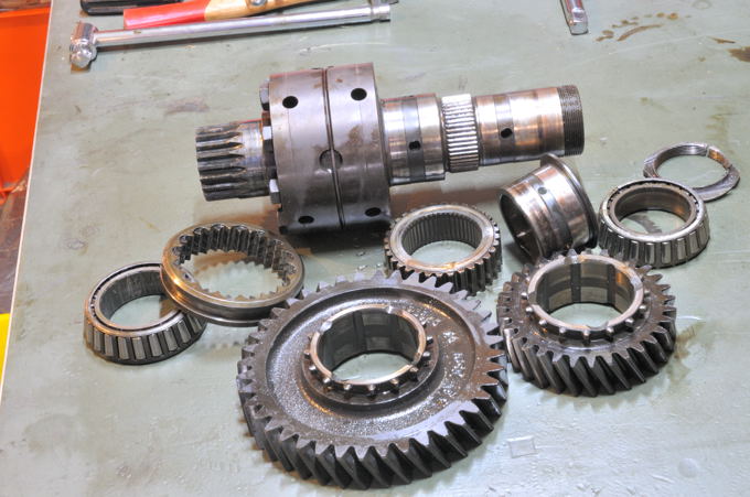 On note en bout de l'ensemble assemblé roulement pignon primaire des dentures de crabot qui n'équipent que les BT de Defender. Encore une preuve que cette BT a déjà subit au moins une intervention et est un patchwork.