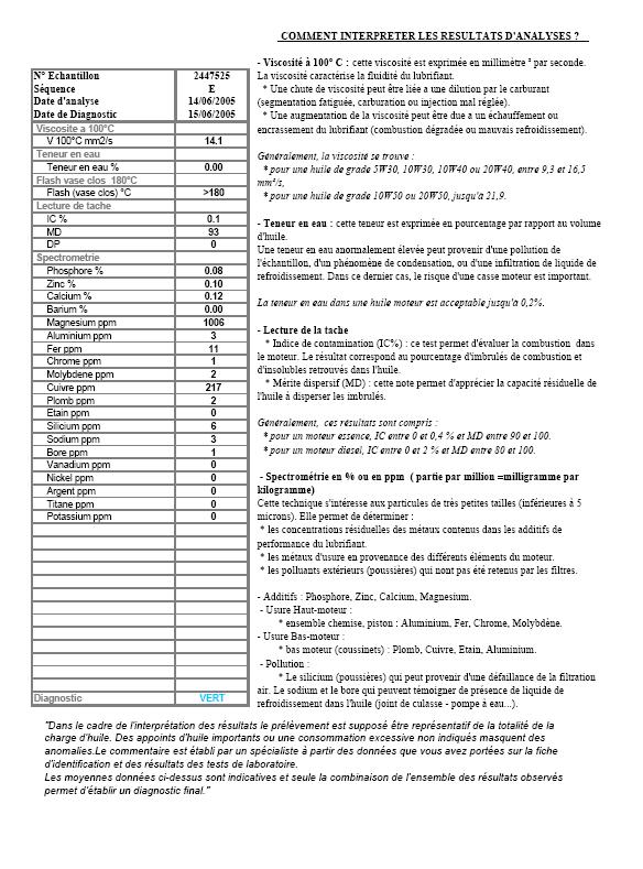 Ce que vous trouvez en page deux, c'est à peu près le style de résultat qui nous parvient quand on fait faire des analyses d'huile dans l'industrie. Pour moi, ce n'est pas succint.