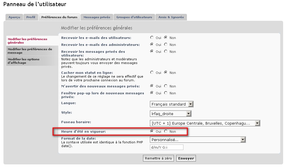 Pour ceux d'entre vous qui sont dans ce fuseau, et qui sont concernés par les changements d'heure, vous pouvez ajuster l'affichage en fonction de la saison dans le "Panneau de l'Utilisateur", onglet "Préférences du forum" :
