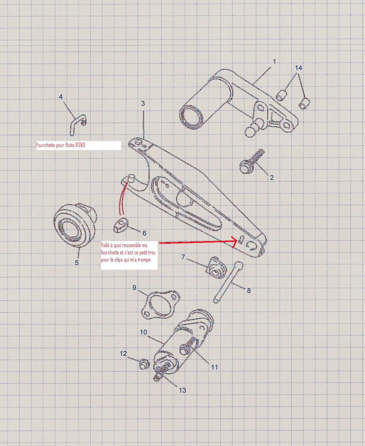 Ta fourchette cà doit-être la fourchette tôle, celle qui a le petits trou pour le clips en U en plastique blanc, l'autre c'est celle du V8 indestructible, elle est en fonte. Vois quand même si tu peux appuyer dessus par un moyen quelconque pour multiplier ta force et agir sur le mécanisme.