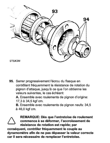 bisnouk a écrit :Non ça c'est un déflecteur d'huile. L'entretoise déformable est entre les deux roulements. Pour la changer, il faut démonter le pignon d'attaque et pour le démonter il faut sortir le différentiel -> outil pour écarter le nez de pont et après refaire un réglage dans les règles.... gros boulot enfin à 1000 lieux de ma compétenceben32 a écrit :l'entretoise deformable c'est la rondelle plate située juste avant le joint spi ?