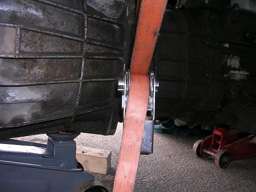 Ensuite pousser la boite vers l’arrière pour désaccoupler puis descendre petit a petit les cricks en maintenant la boite verticale et en desserrant la sangle au fur et a mesure, une fois les cricks au plus bas, faire levier et poser la boite côté transfert sur une « planche a roulette, moi j’ ai utilisé un skate board » le côté cloche n’est pas très lourd. Ensuite j’ai levé un coté de la voiture avec un crick Jack (prevoir le calage de la voiture) jusqu'à ce que la boite passe dessous, reste à retirer la boite pour inspection cette fois ci dans le garage. 18) première constatation :