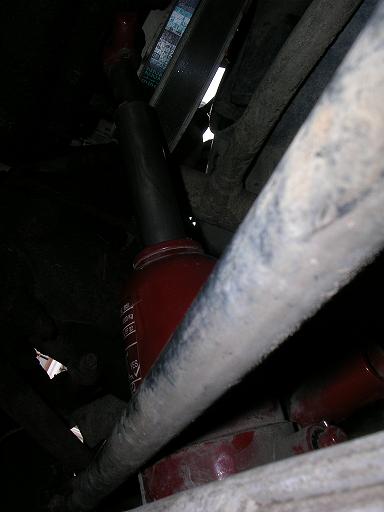 10) Démontage de l’ensemble récepteur et amortisseur sans ouvrir le circuit (attention a l’axe de poussée de fourchette et ne plus manœuvrer la pédale d’embrayage). 11) Démontage du Cache venturi supérieur pour éviter au ventilo d’accrocher. 12) Démontage de la durite d’intercooler et des durites eau supérieures car celles-ci seront sollicitées lors de l’inclinaison de l’ensemble moteur boite, j’en ai profité pour refaire mon joint de carter de pompe (fuite classique) plus le remplacement de la pompe ainsi que le roulement du galet tendeur, ca c’était le petit bonus Merci Land rover Faq et a vous tous. 13) Relever les 2 durites près du tablier pour éviter d’être pincées. 14) Mise en place des cricks, 1 sous la BT transfert et 1 sous la BT principale plus une sangle sous la boite et autour du châssis pour assurer l’ensemble. 15) Lever la BT transfert pour soulager le berceau, retirer les dernières vis et enlever le berceau (un maillet peut aider car le berceau est serrant sur le châssis a cause de la rouille, j’en ai profité pour poncer tout ca et remettre en peinture avec une peinture de galvanisation a froid). 16) Commencer a descendre la BTT et vérifier que rien n’accroche au niveau du moteur (ventilo durite, câble etc.…) jusqu’ a ce que le moteur arrive contre le tablier, la, assurer le moteur pour éviter qu’il ne bascule lorsque la boite sera désaccouplée, moi j’ ai utilisé mon crick bouteille en le plaçant a l’avant entre mon SKI et entre la poulie et le carter moteur.