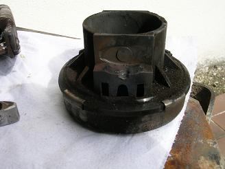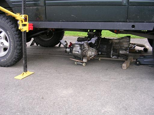 Ensuite pousser la boite vers l’arrière pour désaccoupler puis descendre petit a petit les cricks en maintenant la boite verticale et en desserrant la sangle au fur et a mesure, une fois les cricks au plus bas, faire levier et poser la boite côté transfert sur une « planche a roulette, moi j’ ai utilisé un skate board » le côté cloche n’est pas très lourd. Ensuite j’ai levé un coté de la voiture avec un crick Jack (prevoir le calage de la voiture) jusqu'à ce que la boite passe dessous, reste à retirer la boite pour inspection cette fois ci dans le garage. 18) première constatation :