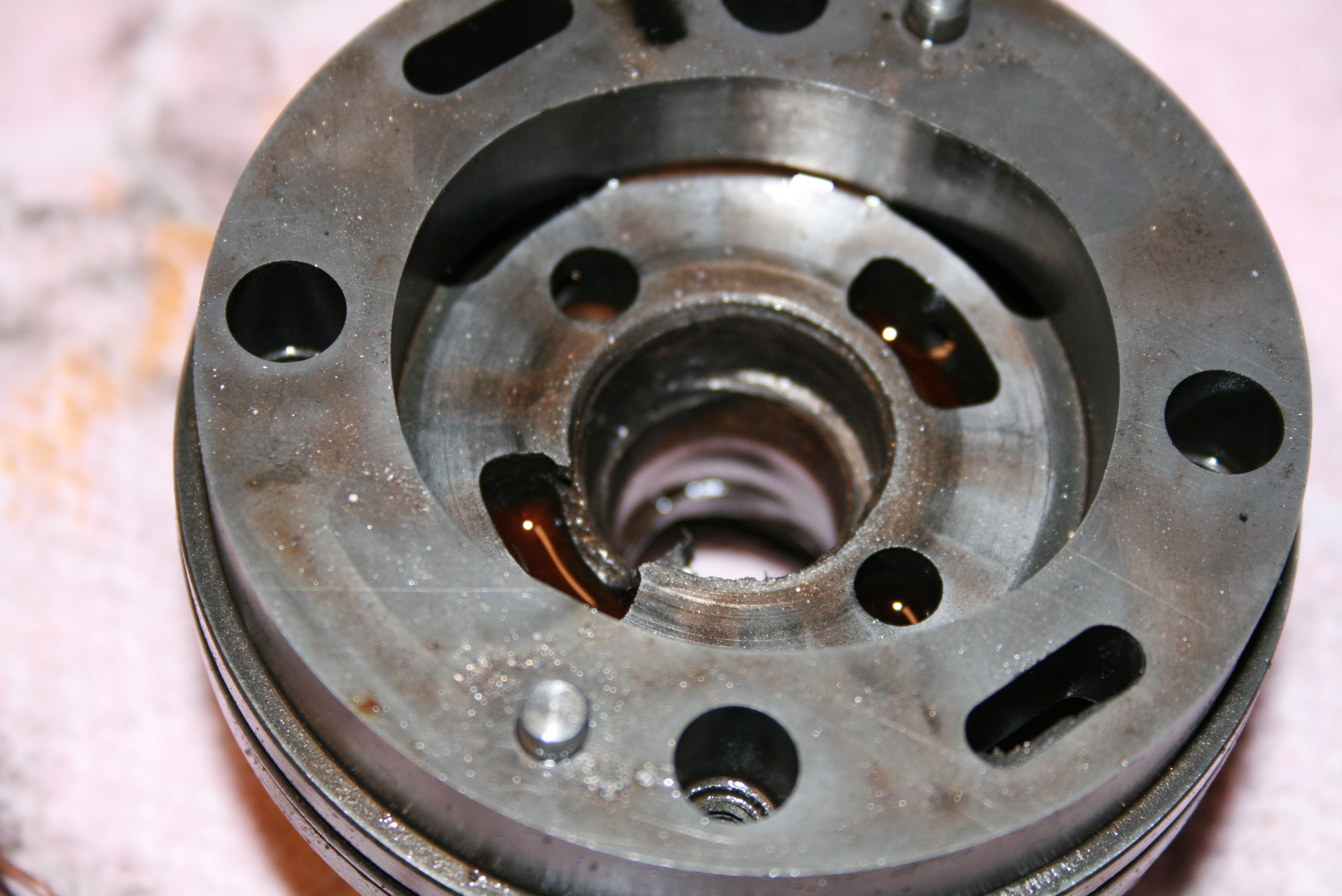 La chaleur engendrée par cette surépaisseur (le bout de fonte) et ces frottements a fait carrément fondre le joint spi de sortie d'arbre, le roulement a "déjanté" aussi à la longue et l'arbre est sorti car n'étant plus retenu ni par la clavette ni par le roulement.
