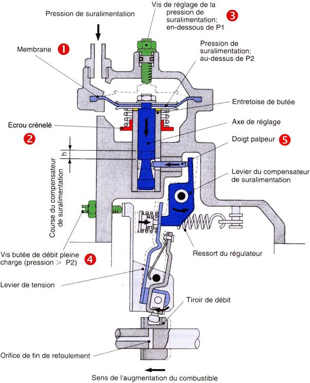 Si on examine la coupe ci-dessus, on s’aperçoit qu’il a été monté sur ces pompes un système permettant de limiter le débit de carburant lorsque le turbo n’envoie pas de pression (le LDA), ceci afin de réduire fumées et pollution. Il y a tout un jeu de leviers et de ressorts qui sont commandés par un doigt palpeur pour faire varier le tiroir de débit.