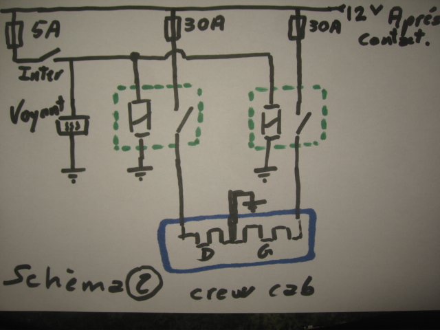 ensuite il faut un relais 40 amperes pour la puissance,un porte fusible 30 amperes,et enfin l'inter du tableau de bord,et des fils electriques.