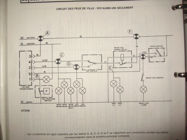 toujours représentés au repos. Donc ici le commutateur de colonne est en position feux éteints. Première position on met les veilleuses. Deuxième position, "HEAD" on peut alimenter soit les phares, soit les codes. La pour moi, il y a une petite erreur dans le schéma. Car il faut espérer que le fil U=couleur bleu soit directement relier entre le HEAD SWITCH et le DIP SWITCH sans passer a travers la bobine du relais d'anti-brouillard, c'est une liaison à contrôler. Si les liaisons