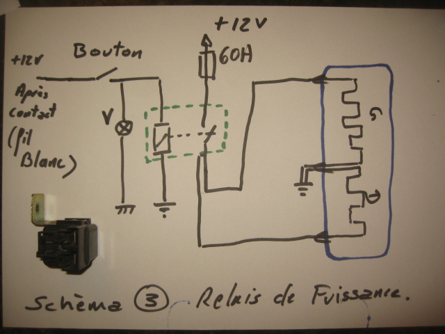 ensuite il faut un relais 40 amperes pour la puissance,un porte fusible 30 amperes,et enfin l'inter du tableau de bord,et des fils electriques.