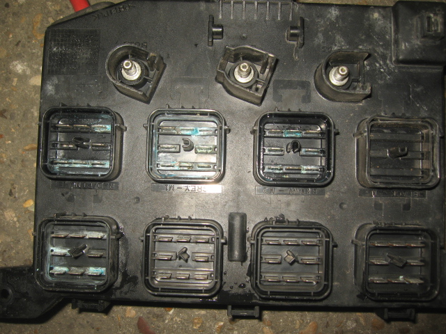 5)Enlever tous les fusibles et les relais. Déconnecter le gros câble batterie en haut à droite sur la photo.
