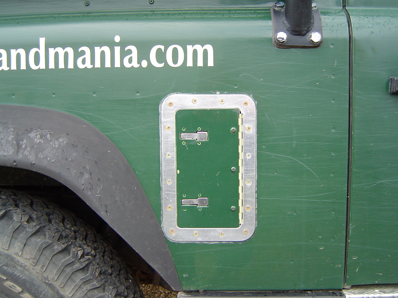 D'abord tailler dans une tôle d'alu de 2 mm l'enjoliveur du contour de la trappe. Ensuite tailler la trappe elle-même. Puis ajuster la trappe et l'enjoliveur avec sa charnière. Confectionner des pièces de remplissage pour rattraper l'épaisseur de la charnière. Là il faut copier les trous sur les pièces de remplissage et les assembler provisoirement avec l'enjoliveur pour retoucher les angles. Ensuite on copie les trous sur le véhicule, toujours avec l'enjoliveur, puis les trous du véhicule sur l'adaptateur de la goulotte, et c'est prêt à poser.J'ai perdu les photos de la découpe sur le véhicule, désolé.Au final ça donne ça. En position ouverte, on remarque l'erreur de positionnement de la goulotte (j'avais pas envie de la refaire).
