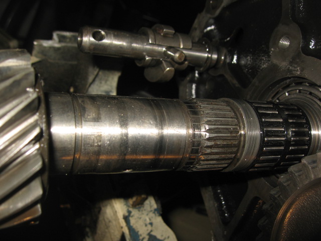 Petit pignon à droite de 5ième sur arbre secondaire. On peut entrevoir la bague de synchro en laiton. La grosse bague de baladeur de synchro qui permet a la fourchette solidariser le pignon de 5 d'arbre intermédiaire (gros pignon)au pignon d'arbre secondaire (petit pignon). La bague ou "rondelle sélective" juste avant le clip, qui peut-être usée aussi et générer un jeu lattérale provoquant le saut de la 5èime. Voir le clip lui même. A défaut, je pense que c'est la bague de synchro bronze de 5ième qui est usé. Mais c'est très difficile d'affirmer quelques chose sans démonter.