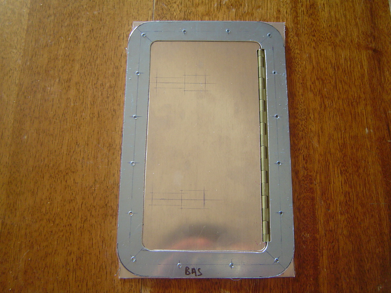 D'abord tailler dans une tôle d'alu de 2 mm l'enjoliveur du contour de la trappe. Ensuite tailler la trappe elle-même. Puis ajuster la trappe et l'enjoliveur avec sa charnière. Confectionner des pièces de remplissage pour rattraper l'épaisseur de la charnière. Là il faut copier les trous sur les pièces de remplissage et les assembler provisoirement avec l'enjoliveur pour retoucher les angles. Ensuite on copie les trous sur le véhicule, toujours avec l'enjoliveur, puis les trous du véhicule sur l'adaptateur de la goulotte, et c'est prêt à poser.J'ai perdu les photos de la découpe sur le véhicule, désolé.Au final ça donne ça. En position ouverte, on remarque l'erreur de positionnement de la goulotte (j'avais pas envie de la refaire).