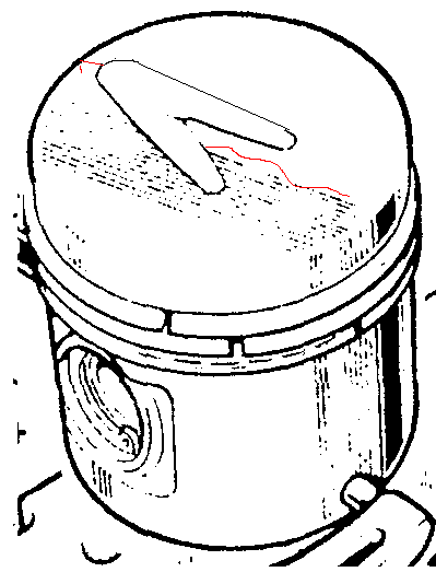 les lignes rouges matérialisent là où j'ai une légère fissure ; au bout de la "flèche de combustion" du piston, celle-ci redescend légèrement sur la jupe du piston sur environ 1 mm