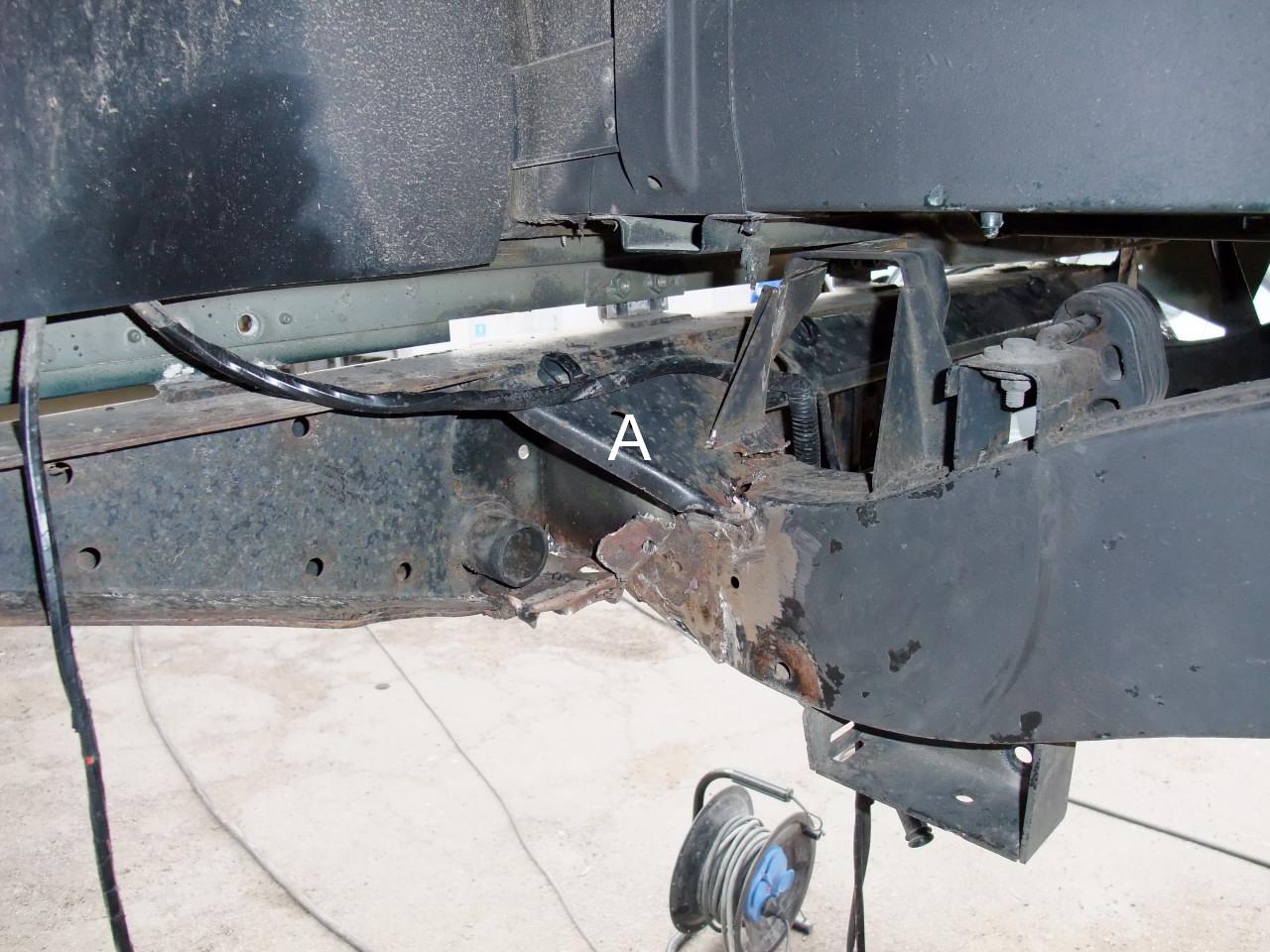 Pièce tordue manquante en rechange car pas dans Microcat. C'est le renfort supérieur (noté A sur une des photos) entre le châssis et la traverse. Elle ne fait pas partie de la traverse neuve. Pièce commandée chez le concessionnaire et on attend. J'ai un doute. Et si cette pièce était partie intégrante du châssis ?
