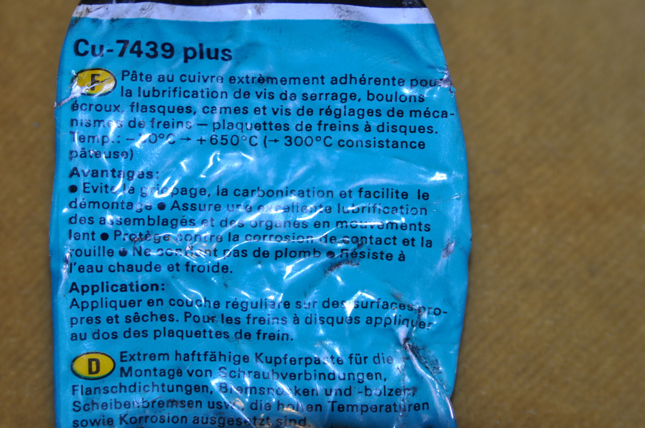 Salut, oui effectivement, mais il n'y a pas grand chose indiquée sur le tube, sinon que c'est indiquéThe Pater a écrit :Qu'y-a-t-il écrit sur le contenant de la graisse ?LØLØ a écrit :Une question pour Pater, au remontage de l'écarteur, j'ai utilisé de la graisse cuivre à cause de sa résistance à la chaleur. Est ce que J'ai bon là ?