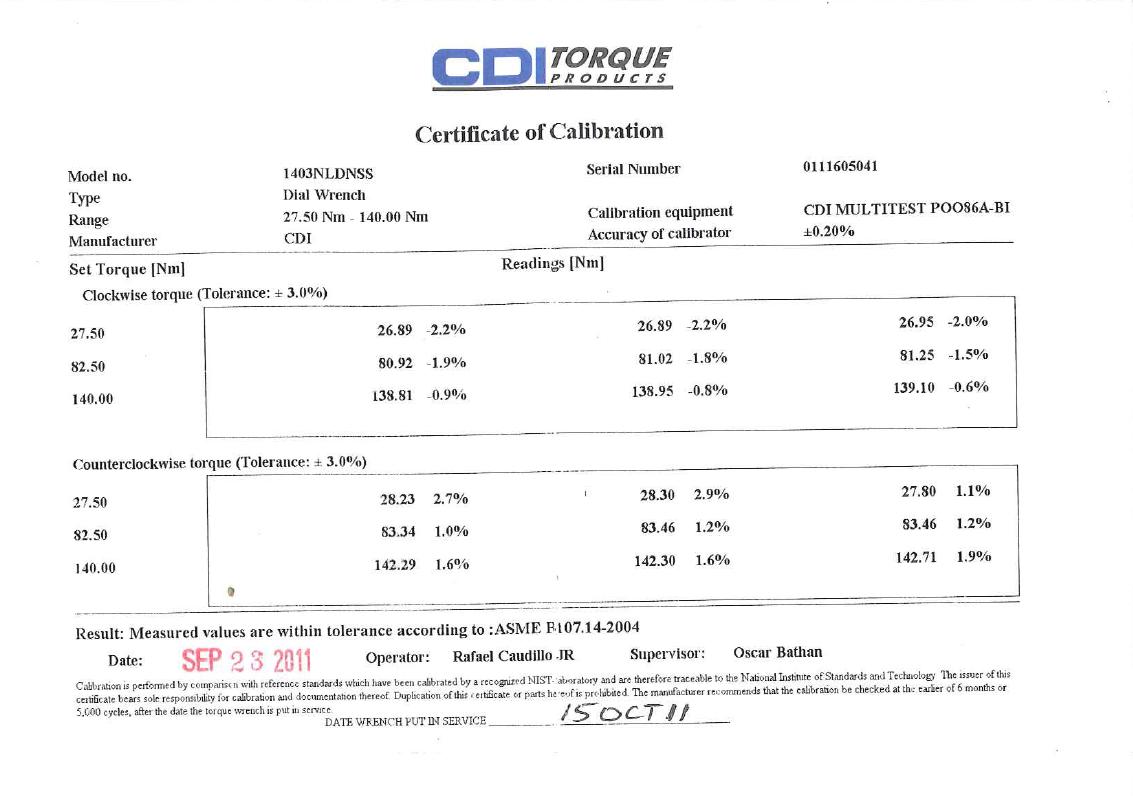 Notes bien que le certificat indique bien que que la clef est faite pour des serrages entre 27,5 Nm et 140 Nm, et non de 0 à 140 Nm.