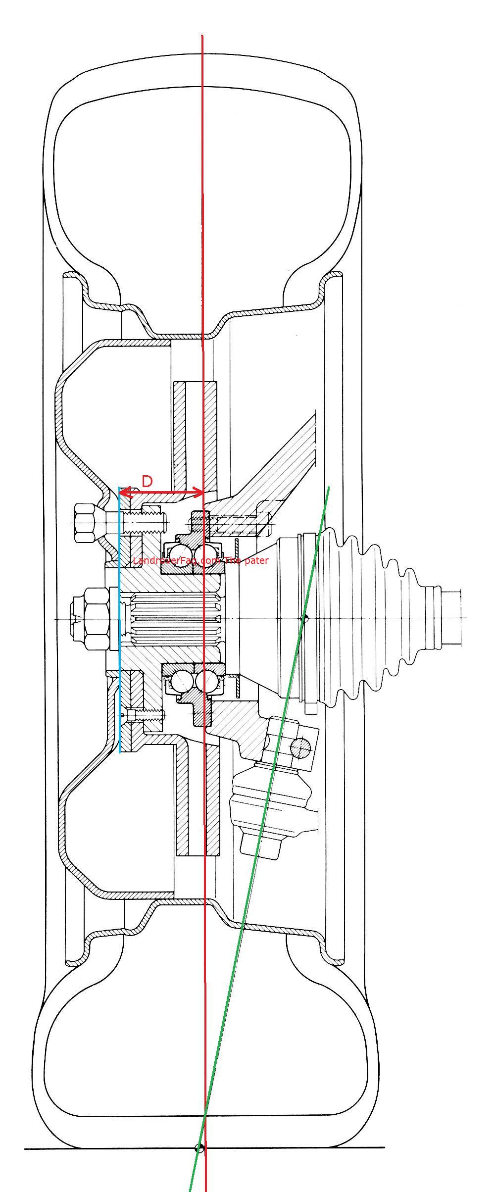 Il y a le déport du train avant, qui fait parti de la géométrie du train et influe la tenue de route, comme la chasse, le carrossage et le pincement. Ce déport est déterminé par la distance, dans cette coupe (on ne prend donc pas en compte la chasse), entre l’intersection du trait rouge et le sol (milieu du pneu dans le contact sol/pneu) et l’intersection du trait vert, qui est l’axe de pivotement de la direction, et le sol. Ici le déport est de zéro.