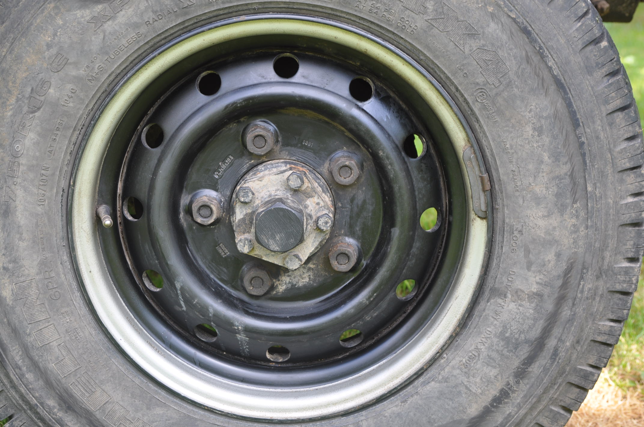 1) Jante militaire dite Wolf que l'on trouve aussi sur les 130 en monte d'origine. Sur les photos, elles sont montées sur un 110 de 1986. Elles sont en tôle plus épaisse que les jantes standards et sur les land avant le 200tdi les goujons sont un peu plus courts d'où le filet en moins sur les écrous.
