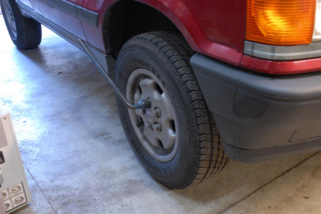 On règlera la hauteur des suspensions sur la position "tout terrain", afin d'avoir le meilleur accès possible aux moyeux de roue, et on ouvre le coffre pour bloquer la voiture dans cette position