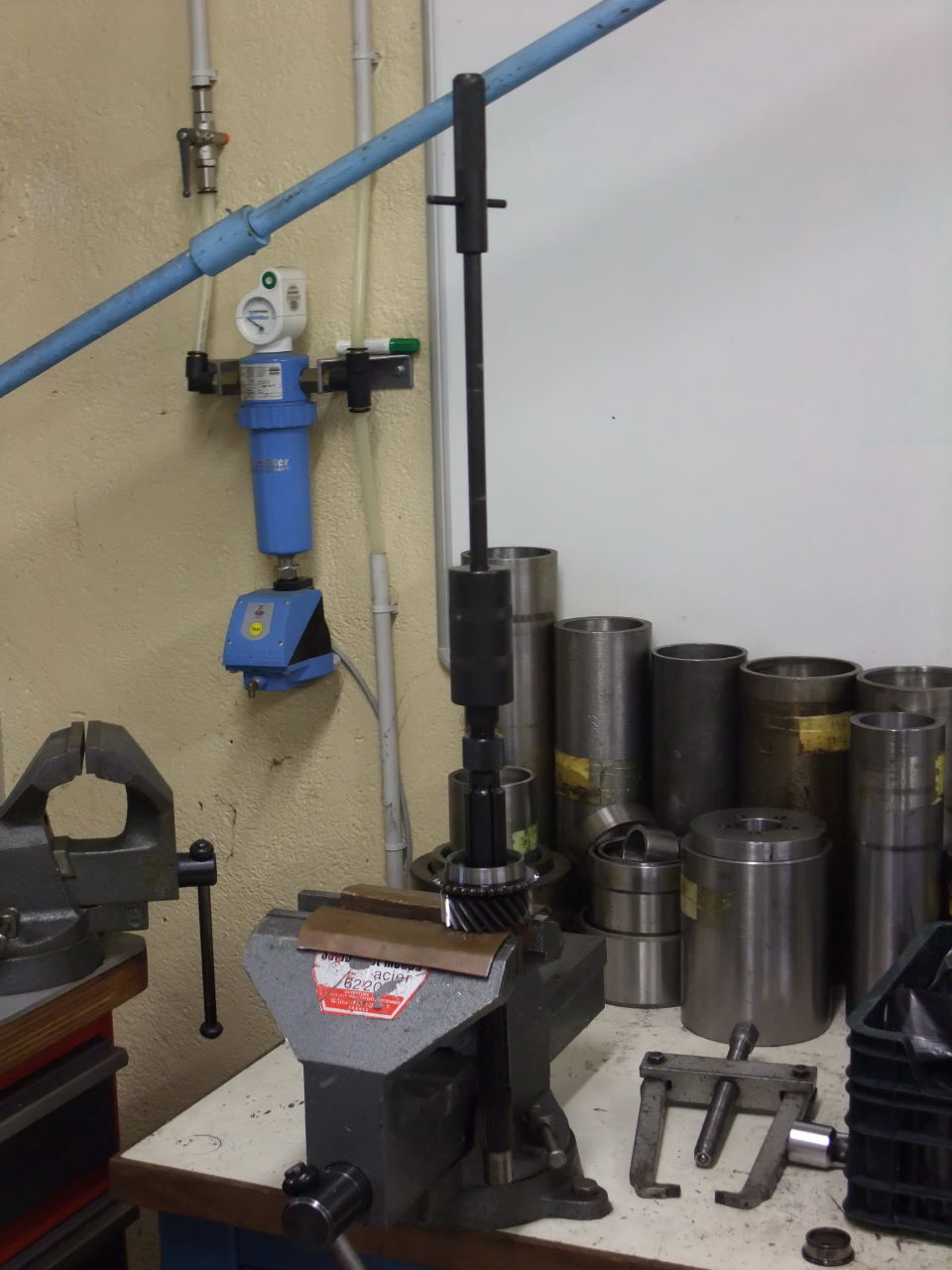 Petit tour à l'atelier du boulot. Pour la bague de roulement restant sur l'arbre intermédiaire, j'emprunte un décoleur dont les mâchoires sont plus fines et passent derrière la bague du roulement. Mais le décoleur étant incomplet, j'utilise un extracteur, lui aussi incomplet.